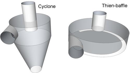 An alternative form of cyclone is what is known as a " Thien-baffle". In a Thien-baffle, the air spirals in a flat shape from the edge to the center, whereas in a cyclone it moves in more of a helical pattern down the cone and then back up the middle.