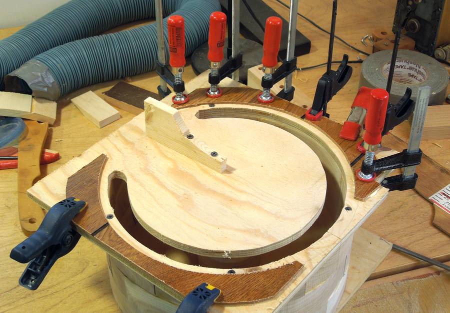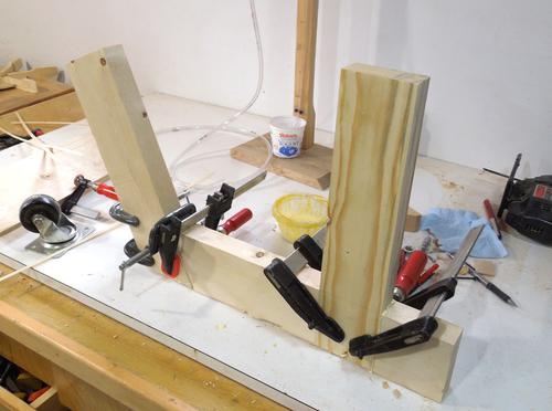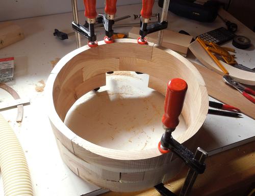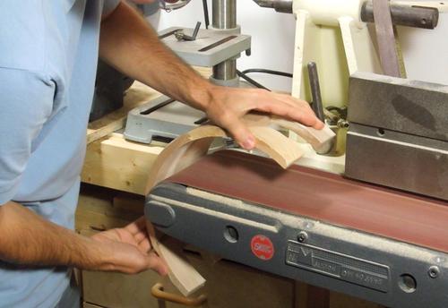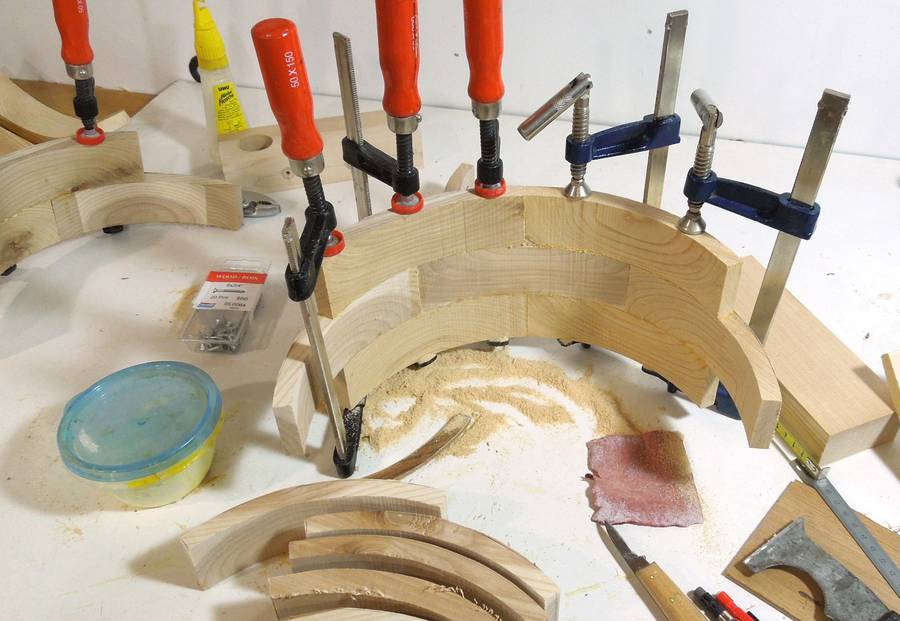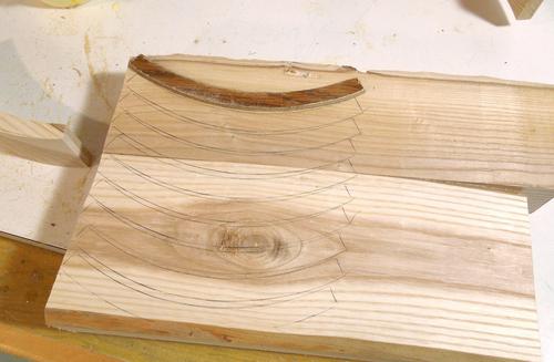 I started with an arc shaped template and used that to mark a series of arc outlines on a thick piece of hardwood. I then cut these out on the bandsaw.