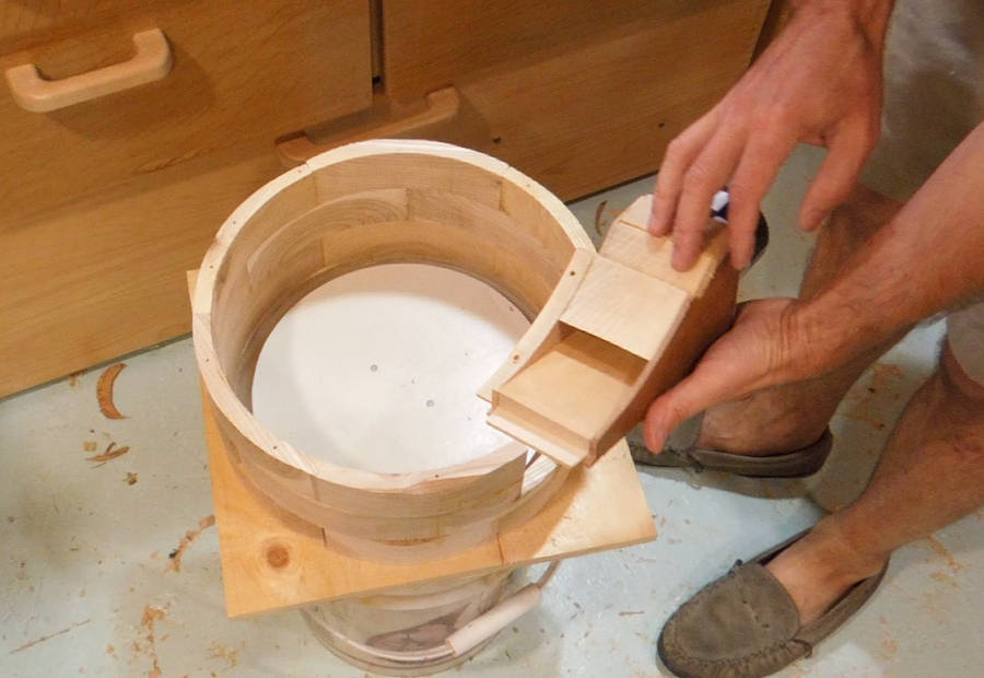I added a spring-loaded lever to hold the bucket up against the separator.
