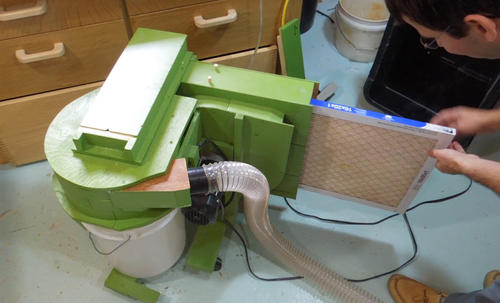 For another test, I sucked the contents of my bandsaw sawdust drawer through as fast as possible. After finishing, I could see that dust was still flowing into the collection bucket. Apparently, the dust had started to pile up on top of the baffle in the cyclone. Checking the filter, it was completely caked with dust!