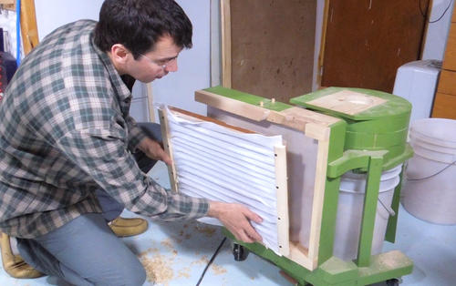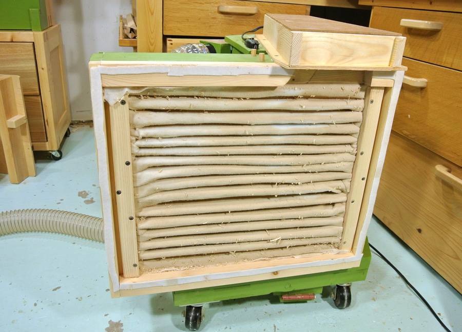 The idea is that the first felt filter will eventually get caked with sawdust. In fact, it needs to get caked to become effective at filtering out microparticles. Seeing that the felt in front of the furnace filter kept the furnace filter at least looking clean, the first layer of pleated filter, once caked, should keep the other layers from getting plugged up. I'm not sure if it all makes that much sense, but the air resistance of all these filter layers, when not caked, is quite low, so no harm in having them in there.