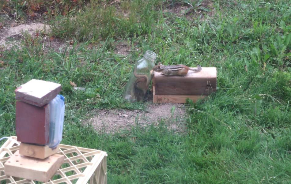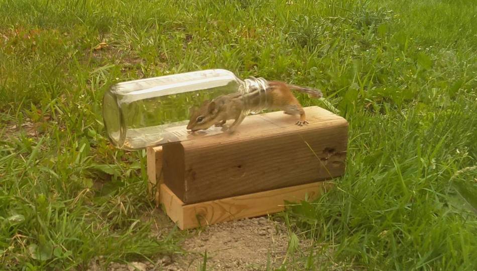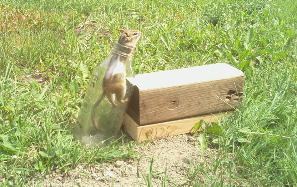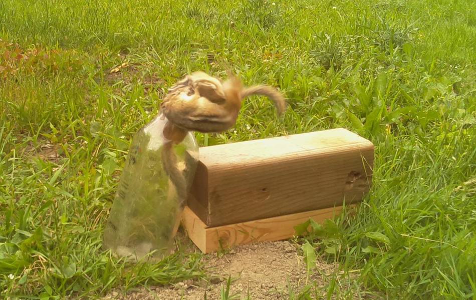 The chipmunk had an impressively cool head to finish eating the bait after the bottle tipped before figuring out how to get out of it. It had a little bit of difficulty getting out, but nothing compared to a mouse jumping out of a 20 liter bucket.
