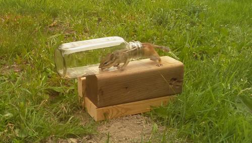 I wanted to set it up so the bottle would tip over once the chipmunk crawled inside to try to trap it, but this took a few tries to get to work.