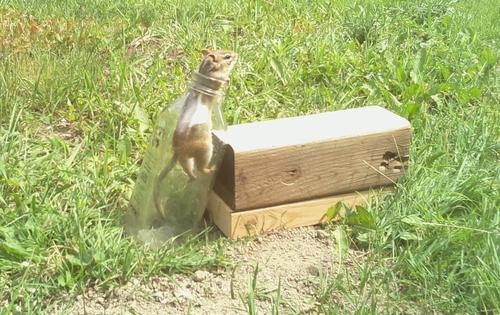 I started my experiments with a plastic juice bottle, which wasn't very clear to look through and had a neck that the chipmunk could just barely make it through. I then got a nice glass milk bottle from an organic food store.