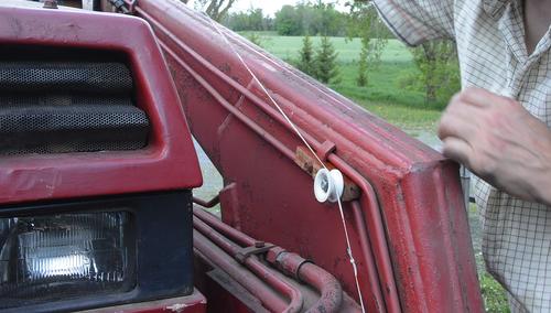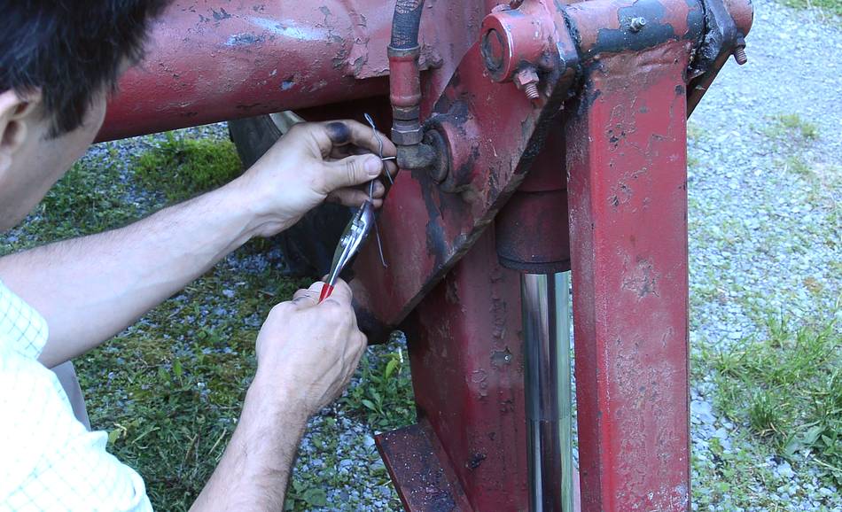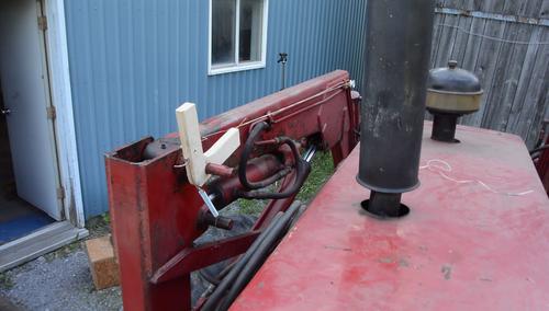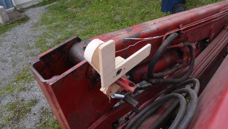 I made a little deflector pulley to mount where the loader bends. I attached this to an existing stud that holds the hydraulic lines. I didn't want to drill any holes into the arm because, by the looks of it, it's welded shut on all sides, and I didn't want to add a place where water could get in.