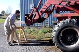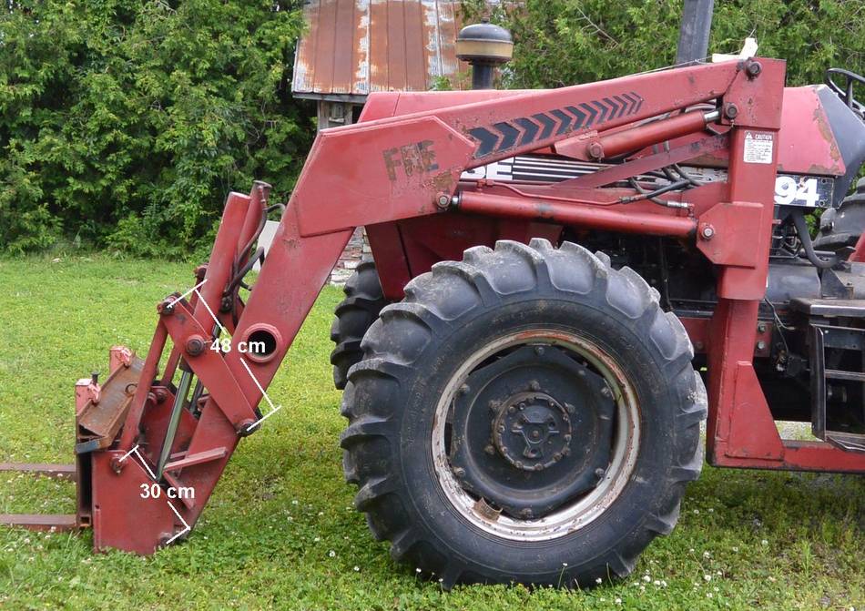 Looking at the linkage at the front, the fork is on a linkage 30 cm long, connected to a 48 cm long linkage which has the hydraulic cylinder on it. I drilled into that, at about 20 cm from the pivot. The link I attached the string to is about 1.5 times longer than the link with the forks on it, so the forks will tilt about 1.5x as much (roughly - four bar linkages such as this are complicated to fully analyze). So for my gadget to deflect about as much as the fork, I needed the string to be attached about 1.5x closer to the pivot than it was on the link. Also, I should make sure the pivot that the string attaches to on the link is perpendicular to the string when the link on the fork is also perpendicular. Using it certainly helps, though I still can't see if the forks are lined up with a pallet, or if the bucket is full, so I may experiment with mounting a camera on it somewhere next.