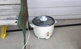 We figured we could let it boil in a rice cooker outside. But the rice cooker is only 500 watts, so it was a very slow boil.