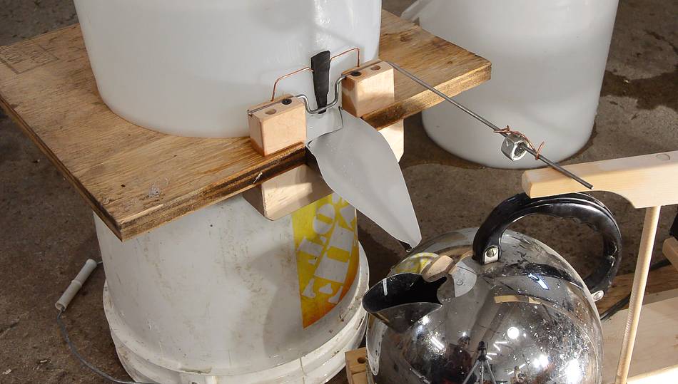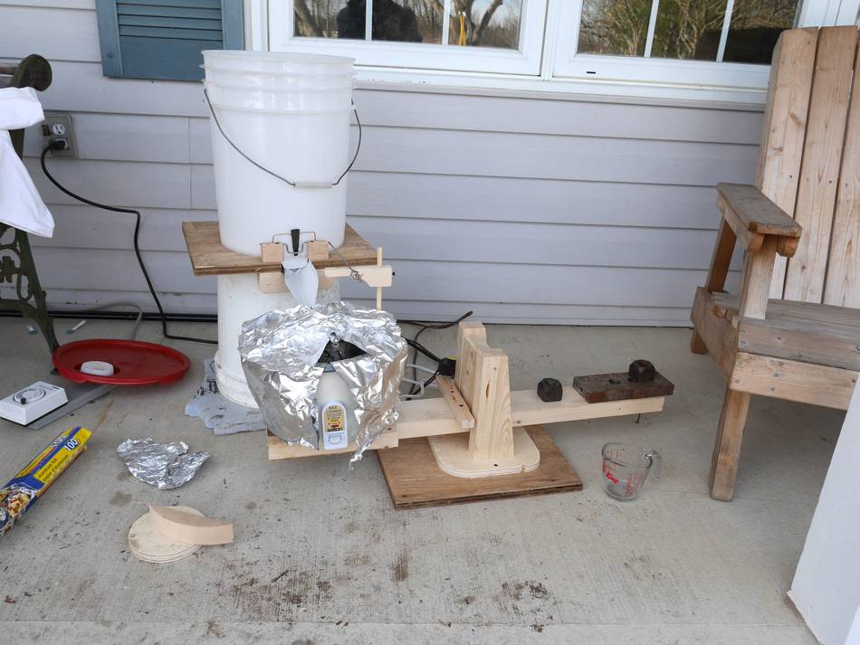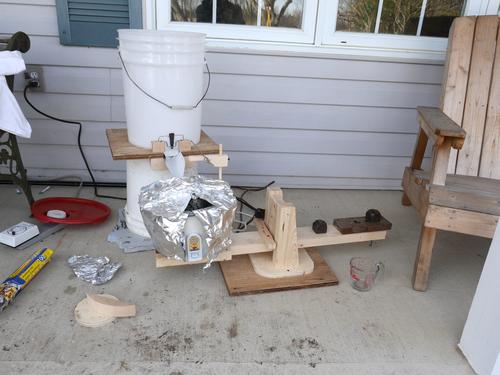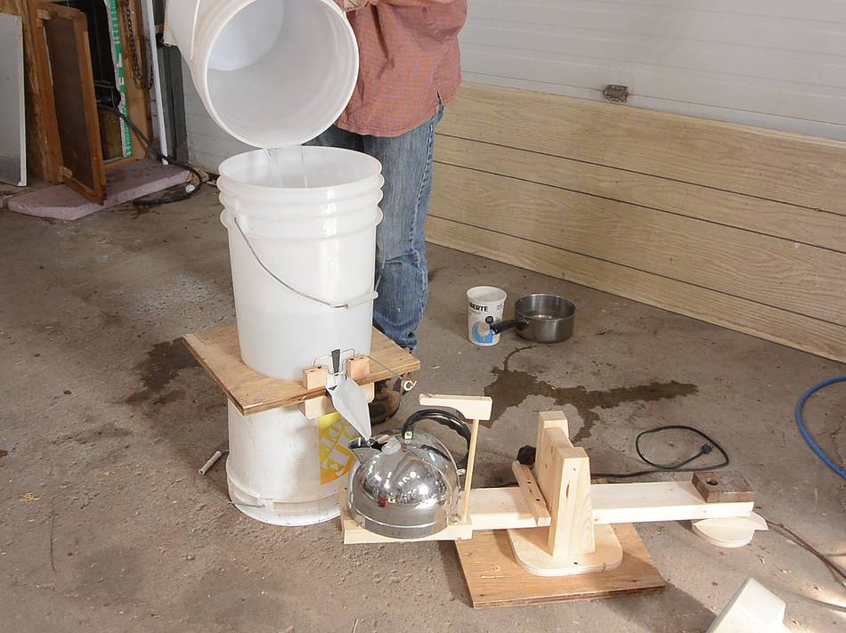 Testing the valve contraption with the kettle. I added a wooden arm to extend over