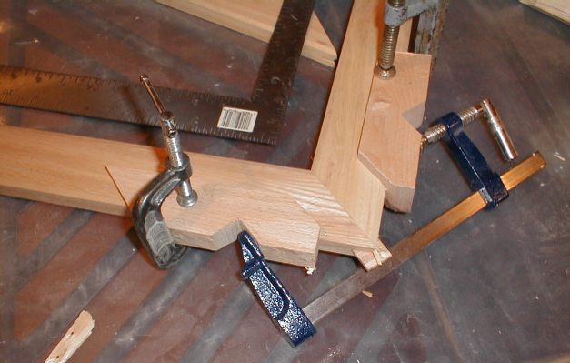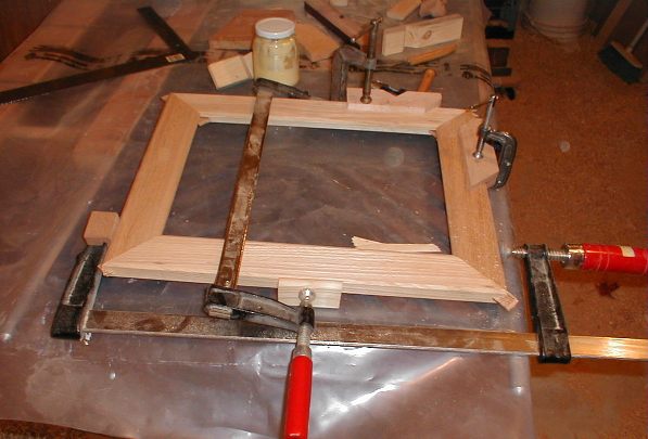 Once these pieces are clamped on, I can apply a regular clamp against them, and apply force at exactly 45 degrees, centered on the joint. This really cuts down on slippage. The other nice thing is that you can glue just ONE joint at a time, instead of having to worry about all four joints at once. It is important to make sure that the joint goes together square, and I always keep my trusty framing square close at hand when I do this sort of thing.