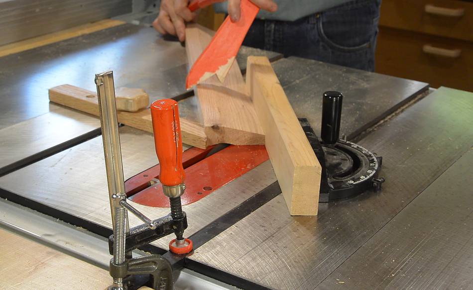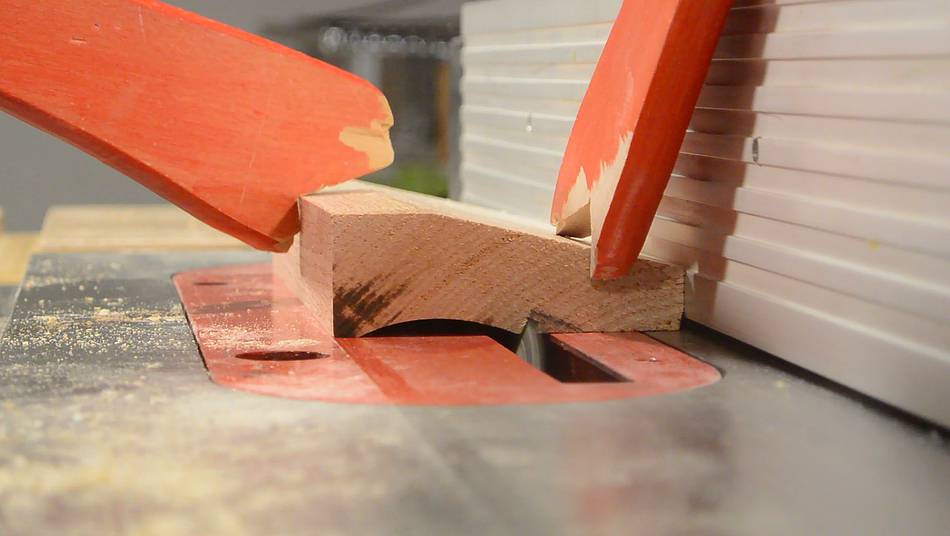 A featherboard is really important for this type of cut, especially because the blade is tilted towards the fence, so the blade has a tendency to pull the wood away from the fence. I raised my featherboard on a block of wood to allow it to push just above where the blade is cutting.