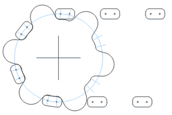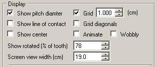 Display parameters![]() This part of the panel selects which aspects of a gear to display. Show pitch diameterWhen selected, a circle is drawn indicating the gear's pitch diameter.