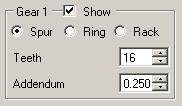 ShowSelects whether the gear is visible. Note that for pinweel gears, the properties of the pinwheel affect the shape of the mating gear, so even if the right gear is hidden, its properties still affect the gear on the left. SpurSelects a regular spur gear. That is, a round gear with teeth on the outside. RingSelects a ring gear. A ring gear is a gear with teeth on the inside. Ring mode can only be selected if the other gear is a spur gear. Ring gears are useful when making planetary gear sets RackSelects a "rack" type gear. A rack is essentially a gear that has been unwrapped. Rack and pinion mode is only currently available for involute tooth types. TeethSpecifies the number of gear teeth.