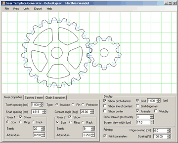 ProtractorSometimes it's useful to be able to create a template that divides a circle into a specific number of intervals. For example, to divide a circle into 23 equal parts with a protractor would be tedious and error prone. Using this program you can print a template that divides the circle as specified. Shaft spacingThis field always displays the calculated shaft spacing value. The shaft spacing is the sum of the pitch radii of both gears. Pitch radius is calculated from the pitch circumference. Pitch circumference is equal to the number of teeth times the tooth spacing. You can also enter a new value in this field and the gear's tooth spacing will automatically be recalculated to produce the desired center to center distance for the two gears. Contact angleThis field specifies the contact angle, also known as pressure angle, for involute spur gears. Larger pressure angles produce gears that have more triangular looking teeth. Larger pressure angles work better for gears with a small number of teeth, but the overall result is lower efficiency due to higher friction in the gear set. This field is only applicable for involute spur teeth and is hidden if other types of gear teeth are selected. Pin diameterThis field specifies the size of the pins for pinwheel gearing. This field is only applicable to pinwheel gearing and is hidden if other types of gear teeth are selected. Gear properties
