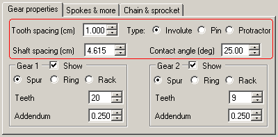 Tooth spacingSpecifies the center to center tooth spacing, as measured along the gear's pitch diameter (this valuie is also known as circular pitch) TypeThis selects what type of gear teeth to draw. The gear's teeth can be spur, pinwheel, or protractor. InvoluteThis specifies involute spur gears. Involute spur gears are the most commonly used type of gear. Any two gears that have the same tooth spacing (or pitch) and the same contact angle (also known as pressure angle) will mesh and run smoothly.