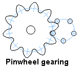 PinFor some applications, it is desirable that one gear be comprised of just a ring of pins. Such gears are also known as "lantern" gears. The pins are typically held together by two discs on either side, so that the whole structure could be said to look like a "lantern". Such a gear may or may not have a shaft passing through the middle of the pins. The primary advantage of this type of gear is that it's possible to make gears with as few as three teeth that will still run smoothly. For pinwheel gearing, the gear on the right will always be the pinwheel and the gear on the left will always be cycloid shaped to mate with the pinwheel.