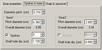 Diametric pitchSome people prefer to use diametric pitch, as opposed to tooth spacing (also known as circular pitch). Diametric pitch is equal to 2 * π / tooth spacing. Some people prefer the program do this calculation for them, so on the "Spokes & More" tab, diametric pitch is shown. You can enter a value in the diametric pitch, and the circumferential pitch on the main tab will automatically be updated. Pitch diameterThe pitch diameter is the diametric pitch times the number of teeth. The pitch diameter is useful for working out gear spacing. The ideal center to center distance of a pair of gears is equal to the sum of the pitch diameters, divided by two. Note that the shaft spacing in the "Gear properties" tab already shows the center to center distance as "shaft spacing". Overall diameterThis displays the overall diameter of the gear, from tip to tip. SpokesSpecifies the number of spokes. Only spur gears above a certain number of teeth are large enough to have spokes. Shaft hole diameterSpecifies the shaft hole to draw. For pinwheel (lantern) gears, this specifies the size of the shaft in the middle of the pins. The gear teeth of the mating gear will be kept short enough so as not to interfere with the central shaft. Specify zero to omit the center shaft or shaft hole. Chain & Sprocket modeThe gear template generator version 2.0 includes a "chain and sprocket" mode. This mode is intended to assist in generating sprocket shapes for wooden block chains and roller chains.