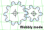 Grid diagonalsDraw diagonal lines on the grid. Diagonal lines are very useful to help align the sheets of a multi-page printout when gluing the pieces of paper together. The diagonals grids work so well, I later wrote BigPrint to allow other types of images to be pasted together this way. AnimateSlowly turn the gears. This allows you to examine how the gears mesh. Note that spur gears with less than 10 teeth and low contact angles will often cause interference. For gears with very few teeth, try pinwheel gears. Wobbly