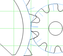 Show line of contactFor involute teeth, this shows the contact angle (pressure angle) and base radii of the two gears. If you think of the base radii as being two spools, a point along a string unwound from the right gear's base radius and wound onto the left gear's base radius would exactly follow the path along which both gears touch. Show centerShow a crosshair in the center of each gear. Draw thicker linesDoubles the thickness of lines used to draw the gear, so that the lines show up better on printouts. Draw unmeshedIf both gears fit on one page, select this option to draw the gears separated so that when you print them, you can cut the two shapes out separately. Also useful for CAD exporting both gears at the same time. Fewer line segmentsApproximate the round curves of the gears with fewer line segments. The difference is not noticeable at a glance, but when exporting and importing into other programs, some programs have difficulty with the number of line segments that the gear program creates. GridDraw a grid. The grid is useful for getting a sense of scale, for checking that a printout was scaled correctly, and to help align multiple pages together when pasting together multi-page printouts.