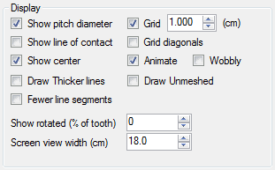 Display parameters![]() This part of the panel selects which aspects of a gear to display. Show pitch diameterWhen selected, a circle is drawn indicating the gear's pitch diameter.