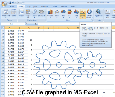 CSV (for spreadsheet)CSV (Comma Separated Values) is the simplest form of export, consisting of just two columns of numbers, plus some annotation. This format can be loaded into spreadsheets such as Excel. You can display the gears as a graph in Excel by selecting the two columns of numbers and generating an X-Y scatter graph from the data.Displaying gears in a spreadsheet is not particularly useful, but it's a good starting point if you wish to manipulate the X-Y points in some way for your own purposes. Image (bitmap)Exports the image as a bitmap (BMP, Jpeg, or PNG). A window will pop up allowing you to specify how many pixels per size unit (pixels per inch, per centimeter or per millimeter), and whether antialiasing (line smoothing) is turned on.If you need to create a PDF for printing across multiple pages on another printer, the best way to proceed is to print to a file. To print to a file, go to "configure printer" under print setup, and select "Microsoft XPS document..." as the printer. Then print. Windows will prompt you to specify a file to print to. Then upload the XPS file to http://www.xps2pdf.org/ to convert it to a PDF file. Note that this trick works with any program that can print to a printer. No need to install special software on your computer to create PDF files. There are also "printer drivers" available on the internet that allow you to print directly to a PDF file on your computer, such as the free Bullzip PDF printer driver , but printing to XPS and then converting doesn't require any extra software installation. SVGSVG stands for scalable vector graphics. Some newer laser cutters and CNC routers are able to import SVG.