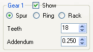 ShowSelects whether the gear is visible. Note that for pinwheel gears, the properties of the pinwheel affect the shape of the mating gear, so even if the right gear is hidden, its properties still affect the gear on the left. SpurSelects a regular spur gear. That is, a round gear with teeth on the outside. RingSelects a ring gear. A ring gear is a gear with teeth on the inside. Ring mode can only be selected if the other gear is a spur gear. Ring gears are useful when making planetary gear sets RackSelects a "rack" type gear. A rack is essentially a gear that has been unwrapped. Rack and pinion mode is only currently available for involute tooth types. TeethSpecifies the number of gear teeth.