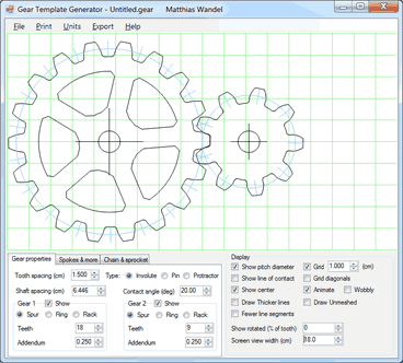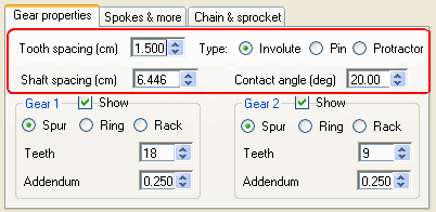 ProtractorSometimes it's useful to be able to create a template that divides a circle into a specific number of intervals. For example, to divide a circle into 23 equal parts with a protractor would be tedious and error prone. Using this program you can print a template that divides the circle as specified. Shaft spacingThis field always displays the calculated shaft spacing value. The shaft spacing is the sum of the pitch radii of both gears. Pitch radius is calculated from the pitch circumference. Pitch circumference is equal to the number of teeth times the tooth spacing. You can also enter a new value in this field and the gear's tooth spacing will automatically be recalculated to produce the desired center to center distance for the two gears. Contact angleThis field specifies the contact angle, also known as pressure angle, for involute spur gears. Larger contact angles produce gears that have more triangular looking teeth. Larger contact angles work better for gears with a small number of teeth, but the overall result is lower efficiency due to higher friction in the gear set. This field is only applicable for involute spur teeth and is hidden if other types of gear teeth are selected. Pin diameterThis field specifies the size of the pins for pinwheel gearing. This field is only applicable to pinwheel gearing and is hidden if other types of gear teeth are selected. Gear properties