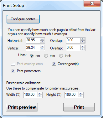 Printer scale calibrationYou may find that your printer prints just slightly larger or smaller than it should, especially if your printer is a laser printer. If you find that 10 grid lines of a one centimeter grid are actually 10.1 cm horizontally, you can compensate by setting the width calibration to 99%. If you switch to "landscape" orientation, the "width" is actually the length. The labels adjust to reflect this. Horizontal / vertical / overlapIf you print gears that span multiple pages, the gears are printed with no overlap by default. You may prefer to have a slight amount of overlap from page to page to give you more confidence in aligning the pages. You can either enter the overlap, or you can enter the spacing of the pages. Note that the spacing and size of the pages always total up to the printable area on a page. You may also find that its quite easy to align the pages even without overlap when grid diagonals are enabled. Print overlap areaYou can select whether to print in the overlapped area. This option is only enabled if an actual overlap is selected using the horizontal/vertical/overlap fields. Center gearsNormally, the gears are in the top left of the page, or group of pages. If you check this, the gears will be centered on the page, or group of pages. Print parametersIf checked, the actual gear parameters will be printed on the top left of the page. ExportingWhen exporting to a file, everything that is drawn on the screen is exported. This included both gears, as well as any center and grid lines you may have turned on. It's recommended that you turn off everything but one gear and its center crosshair before exporting. Otherwise, it can be difficult to separate the gears from the grid in whatever program you are importing into.No printer pagination will be applied to export.