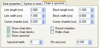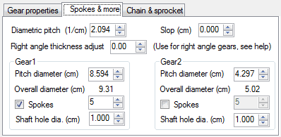 used for involute spur gears. Pitch diameterThe pitch diameter is the diametric pitch times the number of teeth. The pitch diameter is useful for working out gear spacing. The ideal center to center distance of a pair of gears is equal to the sum of the pitch diameters, divided by two. Note that the shaft spacing in the "Gear properties" tab already shows the center to center distance as "shaft spacing". Overall diameterThis displays the overall diameter of the gear, from tip to tip. SpokesSpecifies the number of spokes. Only spur gears above a certain number of teeth are large enough to have spokes. Shaft hole diameterSpecifies the shaft hole to draw. For pinwheel (lantern) gears, this specifies the size of the shaft in the middle of the pins. The gear teeth of the mating gear will be kept short enough so as not to interfere with the central shaft. Specify zero to omit the center shaft or shaft hole. Chain & Sprocket modeThe gear template generator version 2.0 includes a "chain and sprocket" mode. This mode is intended to assist in generating sprocket shapes for wooden block chains and roller chains.