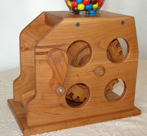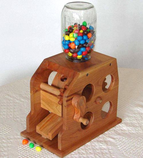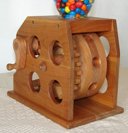 "I made two of these M&M feeders for Christmas presents. I cut the gears out on the band saw, then sanded them to the line with a 1" strip sander. They were such a big hit. You get 3 M&Ms per turn of the small crank. It is made of solid cherry. And yes the Ball jar screws into the top. Turns out a Ball jar has 4 threads per inch, the coarsest thread I can cut."