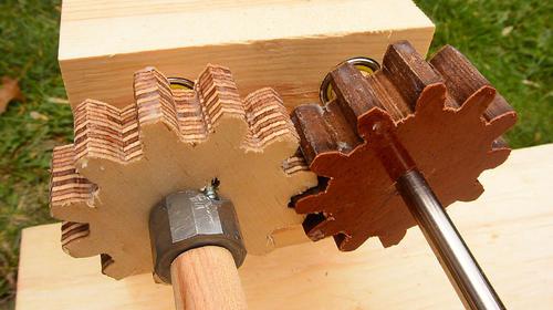 with wooden spacers in between the gears and bearings to keep things