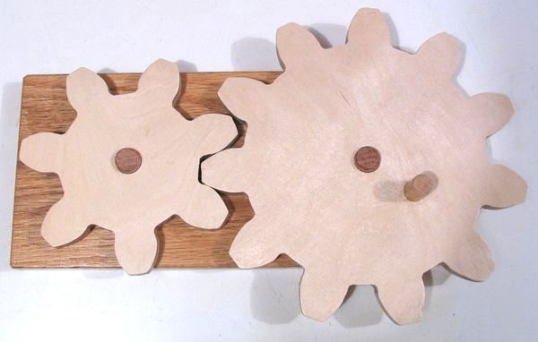 I put two dowels into a piece of oak, and added another dowel to the larger of the two gears