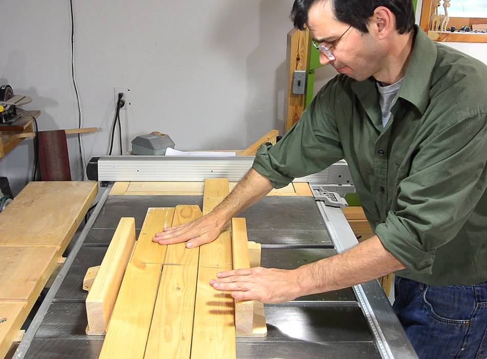 I have to say, it seems more intuitive to put the board on the saw the wrong way. When I did that, not all the bevels on the triangles are facing up or facing down at the same time. I made a number of scrap triangles this way! So watch out for that mistake if you make one of these!