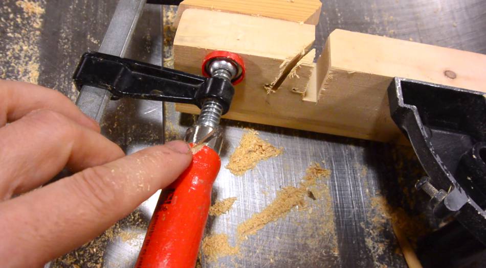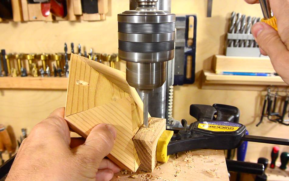 I rigged up a temporary pocket hole jig out of wood. I'm drilling 17/64" (7 mm) holes for a #4 screw.