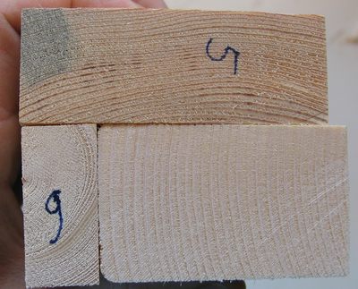The hardest piece of spruce is the blue stained piece at the top, labeled '5'. My softest and lightest is the one below right.