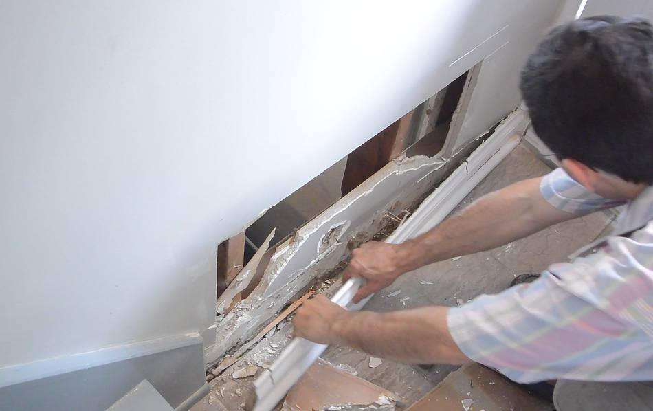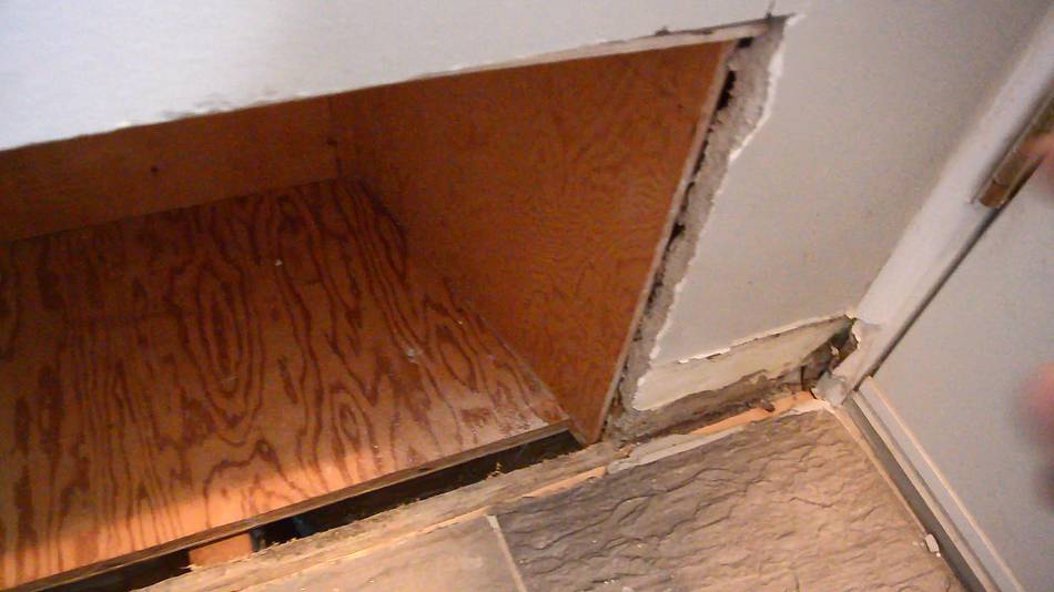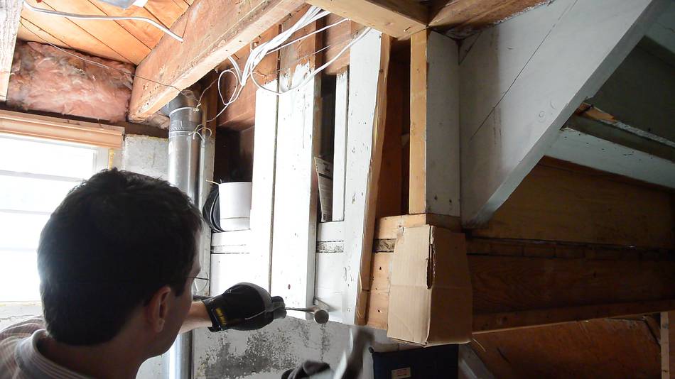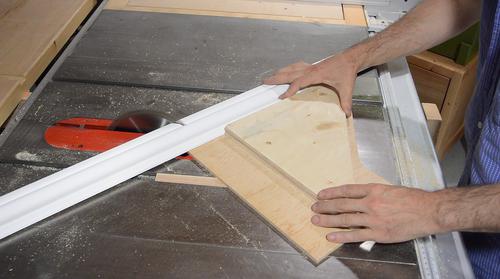 I also added a new vertical board where I had removed the broken one. The original boards tied the landing to the joist above, so it's very important to put one back in to hold it up again. I used a lot of screws, and screwed in at an angle to really pull the landing up against the joist. I also moved the outlet for the sump pump. Installing the trimCutting the trim. I used some cheap MDF trim.