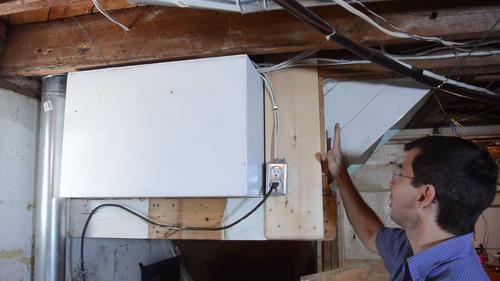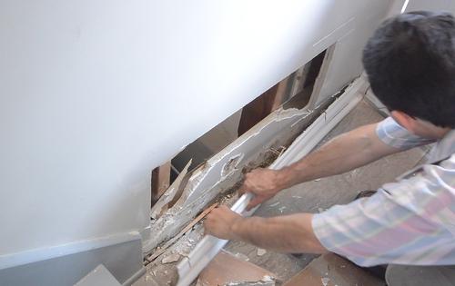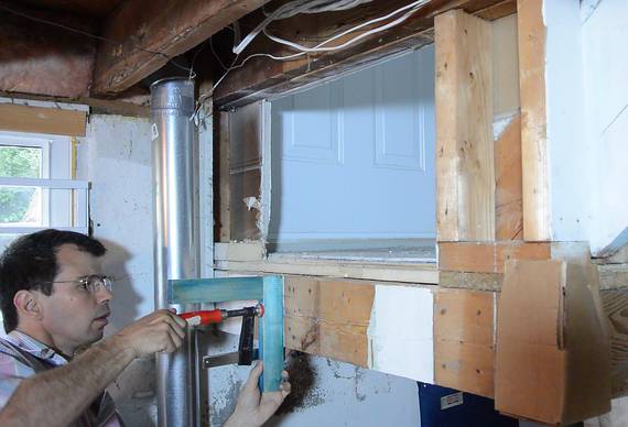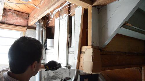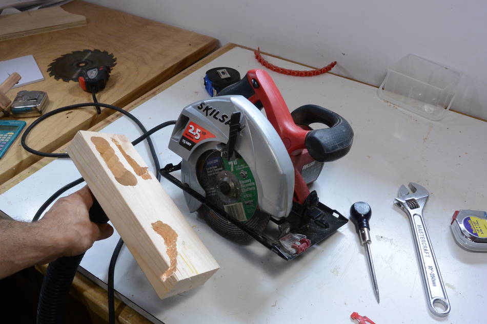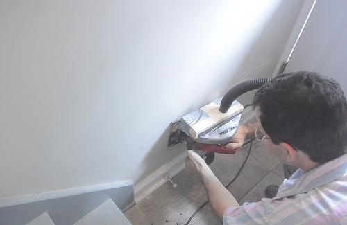Cutting through the plaster wallsMy house was built in 1954, before drywall was commonly used, so the walls are built with mortar and plaster. This makes for very sturdy walls, but also makes it necessary to cut them with a masonry blade. This makes for a lot of really awful dust.I made this adapter piece to connect a ShopVac hose to a cheap skillsaw. I used duct tape to attach this to the saw.