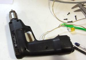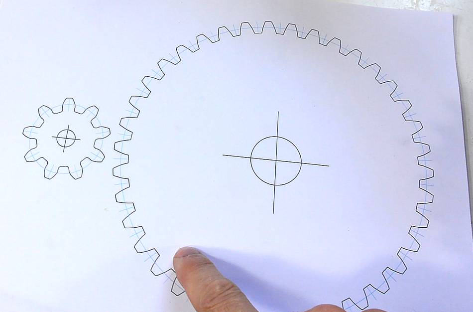 A windshield wiper motor might be ideal for that, but I didn't have one at hand. My next idea was to use an old cordless drill (batteries long expired) and gear it down with wooden gears. Here, my design for the final reduction to the wheels (with my gear program, of course).