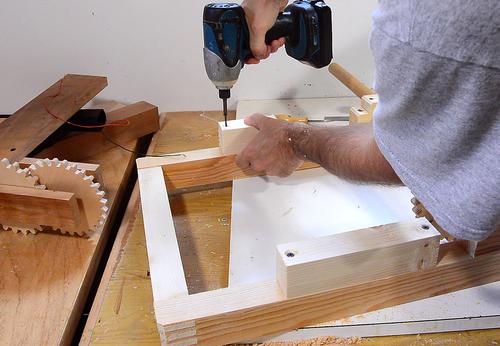 I made some wooden pillow blocks for the main axle bearings, much like I did for the apple grinder. The way to make sure the holes line up is to start with a solid block of wood, drill pilot holes for the screws, then cut the block apart where the hole is supposed to go, screw it back together, and only then drill the main bearing hole.