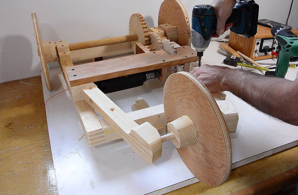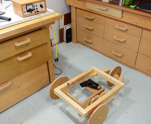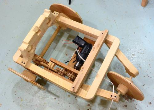 Having worked out the gear train, I built a wooden frame to use as a chassis
