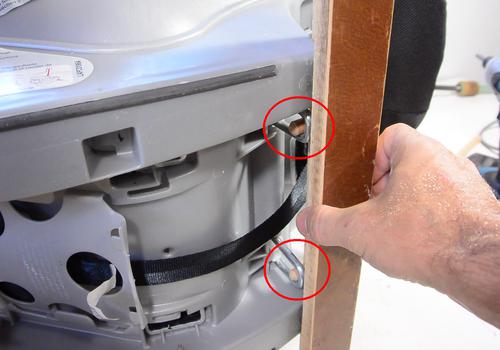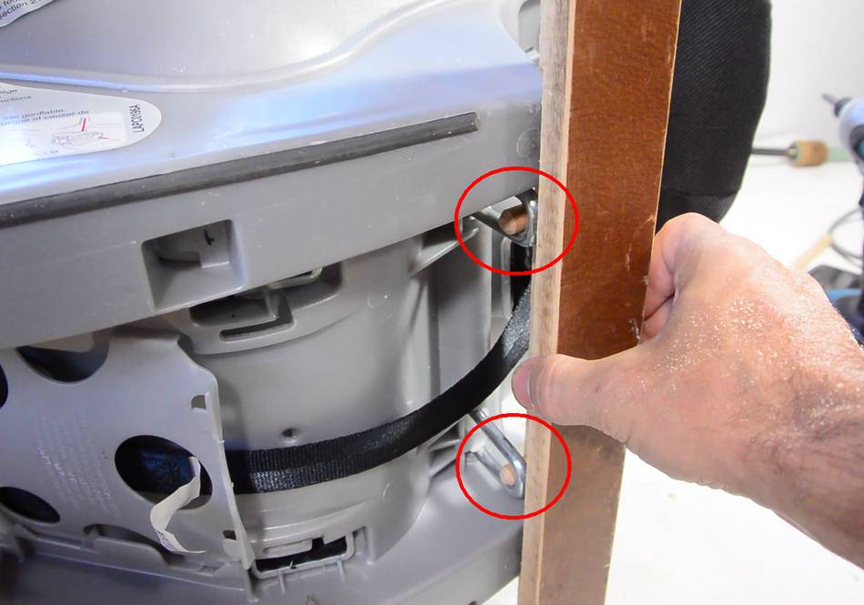A larger bar on the back fits the seat's supports and the red hook for locking it in.