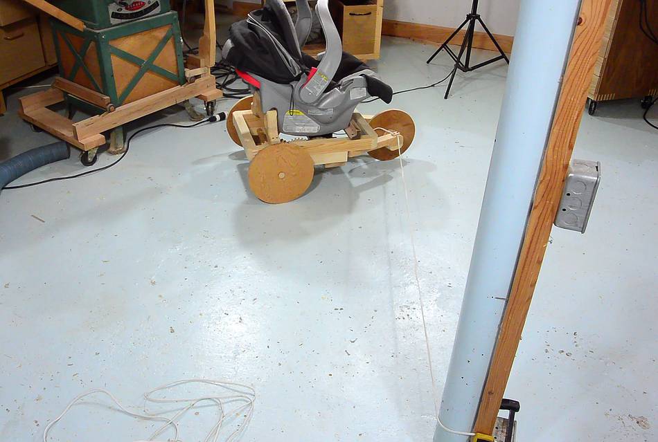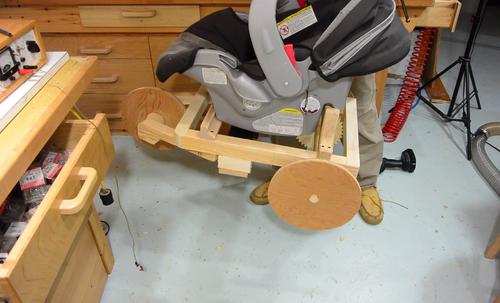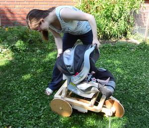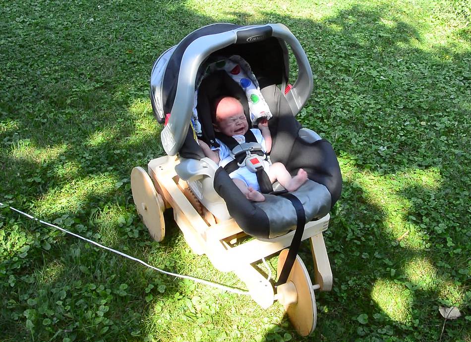Our baby Harriet really likes car rides and stroller rides, so I was thinking of a machine to simulate that. Ideally, with some slow turning bumpy cams to make for irregular motion. My next thought was to make something that slowly pulls the stroller across a bumpy lawn, and from that, figured, why not some sort of motorized carriage to drive the baby in circles on the lawn?