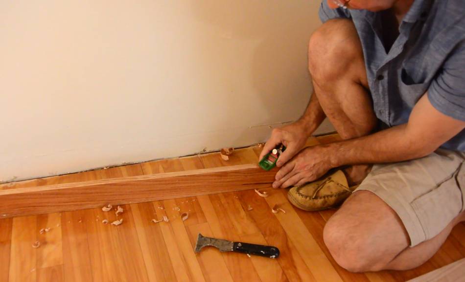 I made the new baseboards about 5 mm taller than the old ones to cover up what was left of this ridge after I scraped it.