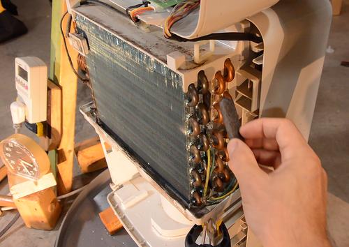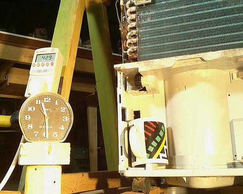 I also had a power meter measuring the unit's power draw. As the unit iced up, power consumption always went up by a few tens of watts. Power consumption typically started at 300 watts, but as the cooling coil became colder and the warming coil warmer, went up to over 400 watts. With a greater temperature difference, the compressor has to overcome a greater pressure difference for the refrigerant to evaporate inside the cooling unit and condense inside the heating part, so it uses more power.