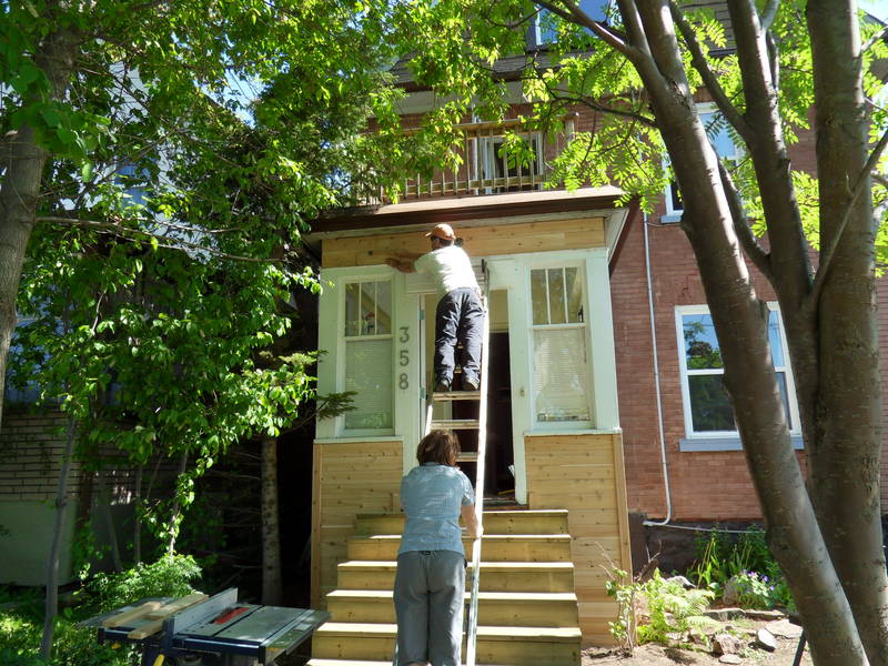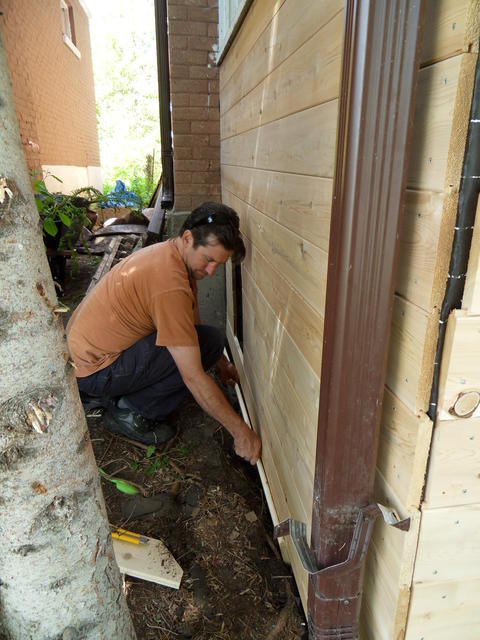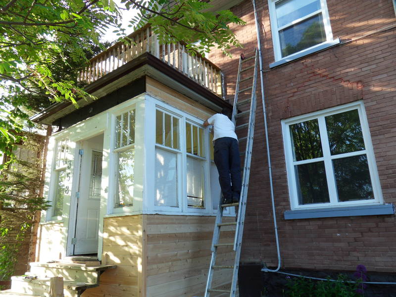 Here's Olivier - putting new siding at the top, just below the deck that I'd built on a previous visit.