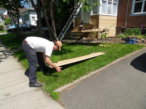Here's Olivier pushing three boards together. We then put a few staples across the back to hold the tongue and grooves together while we lifted the assembled panel up and nailed it in place.