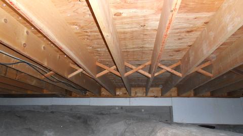 Tara's house, being built in the 1980s, has a plywood subfloor, so no need for this. But the hardwood floor boards were nailed in parallel to the joists. So whatever stiffening the floor boards should have provided didn't happen here. I'd consider this a slight defect in construction, but an upside of it was that the floor, though it had lots of give, didn't creak. Basically the hardwood floor boards, oriented the way they are, aren't add much stiffening, but at the same time, the flexing isn't pulling on the nails either.