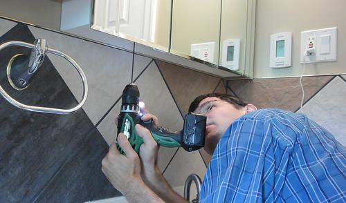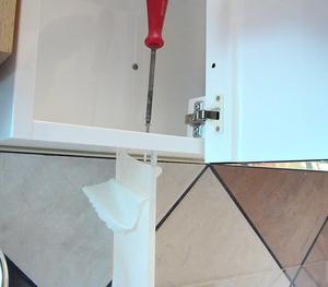 Propping the shelf up with some slippers while I screw it to the cabinet,