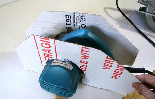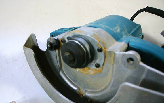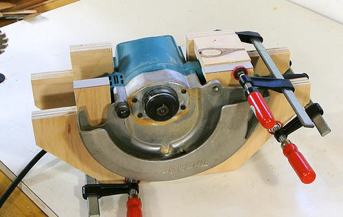 J'ai commencé par enlever la semelle, le mécanisme de réglage de la hauteur de coupe et une partie du carter de protection d'une Makita. La Makita est une scie agréable à manier, de bonne qualité et moins bruyante que les autres scies.
