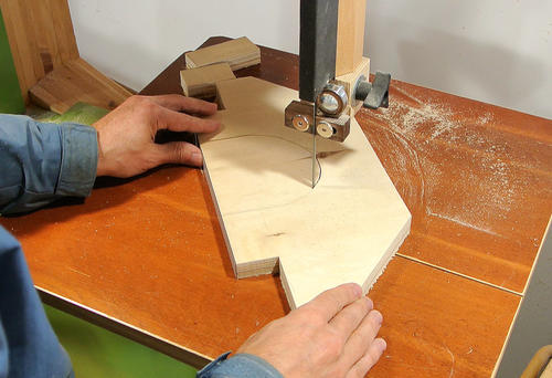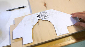 Comme c'est un projet assez expérimental je découpe d'abord des gabarits en carton pour mieux visualiser l'ensemble. Je reporte ensuite les tracés sur du contreplaqué...