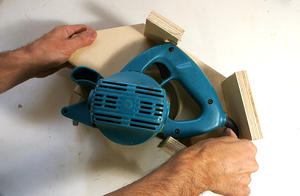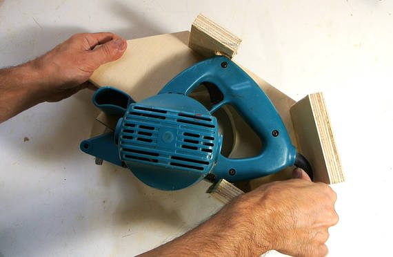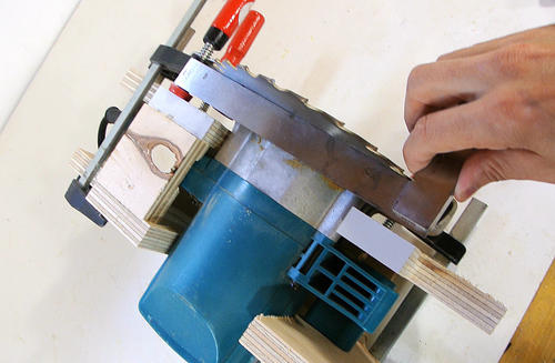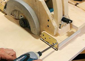 Je vérifie le bon alignement de la lame de scie. Elle doit être parfaitement parallèle au contreplaqué.